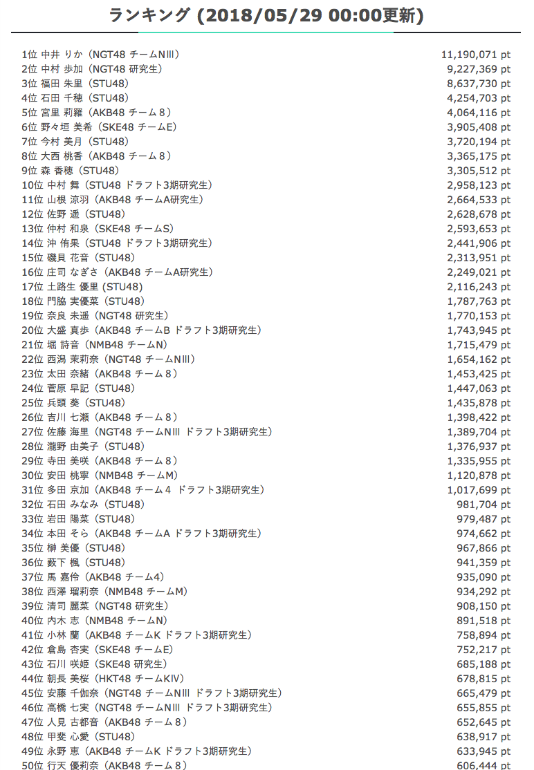 1位 中井 りか(NGT48 チームNⅢ)11,190,071 pt